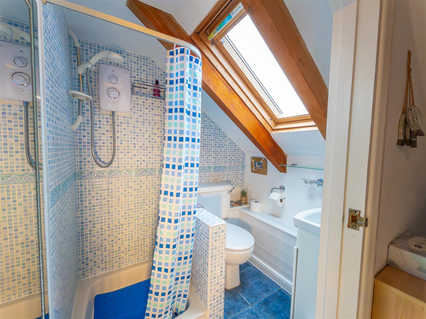 With tiled floor, tiled cubicle housing Mira Jump electric shower, low level W.C., wash hand basin in vanity unit and velux style window.