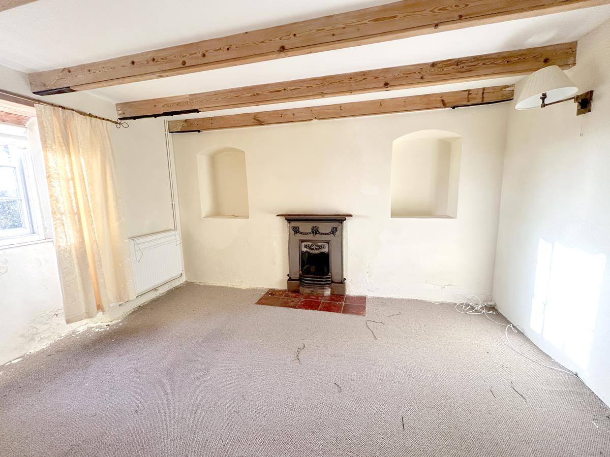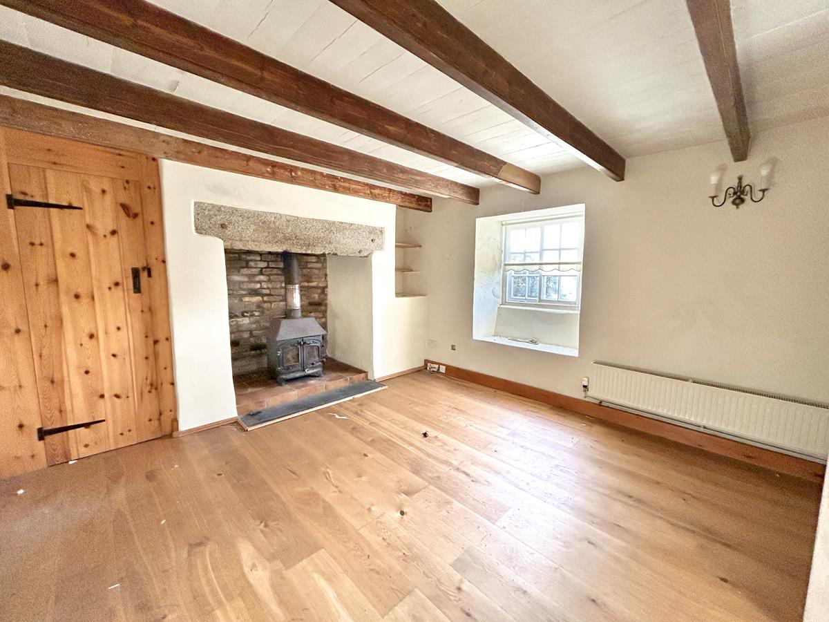 A characterful room with inglenook fireplace, with granite lintel over and woodburner (not tested) set on a tiled hearth. There is a built-in storage cupboard, beamed ceilings, wood effect flooring and a sliding sash window to the front aspect.