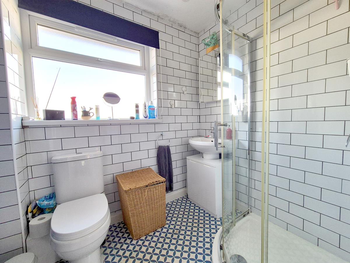 Comprising a close coupled W.C., pedestal wash basin with mixer tap and a shower cubicle. There is a heated towel rail, partially tiled walls and frosted window to the rear.