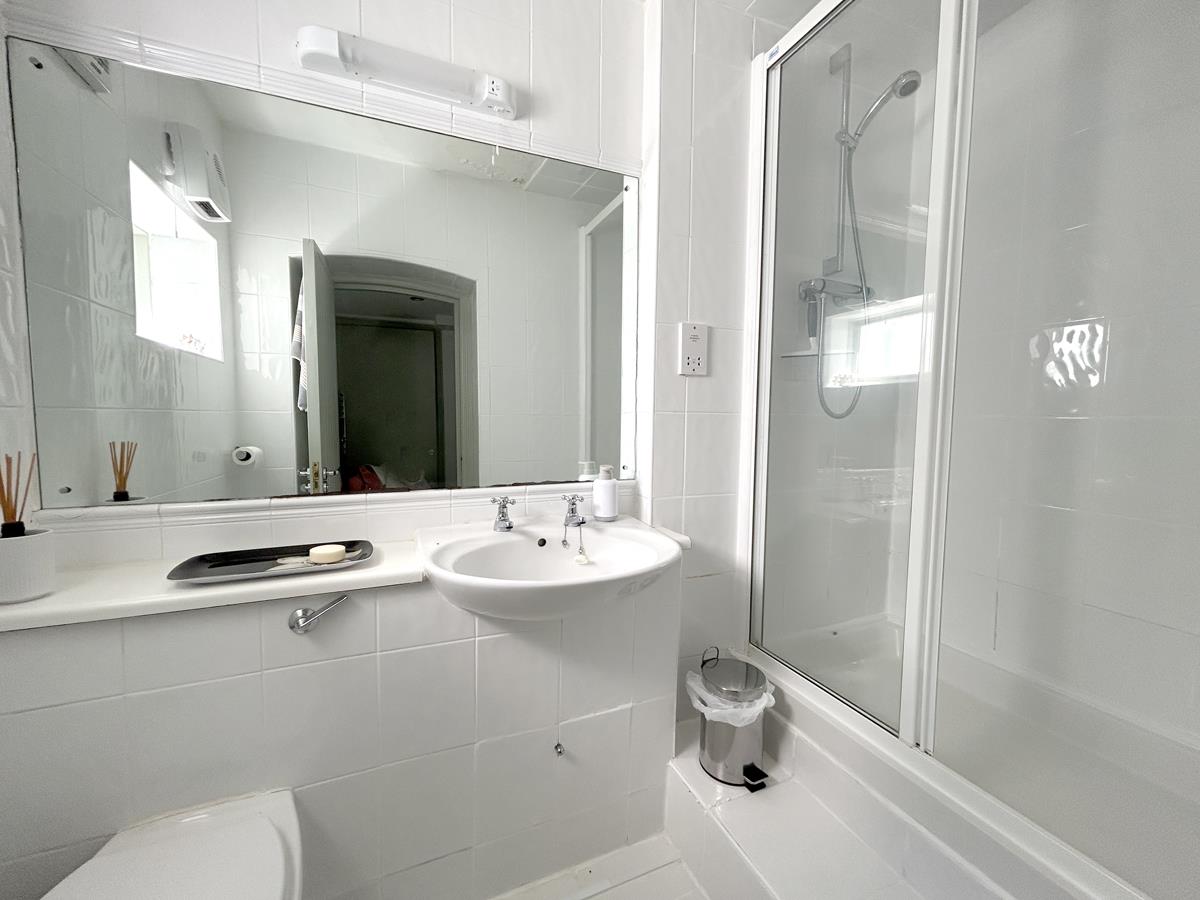 With glazed and tiled walk-in shower cubicle with tiled splash back. A wash hand basin, with shelf, mirror, light and a shaver socket over. A concealed cistern w.c., extractor, electric down flow heater and tiling to the wall and floors.