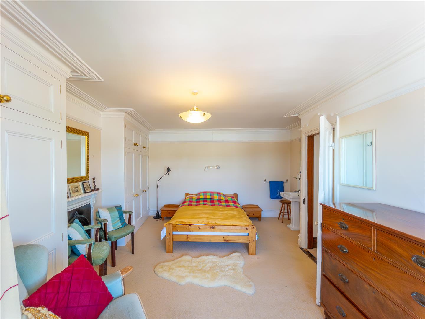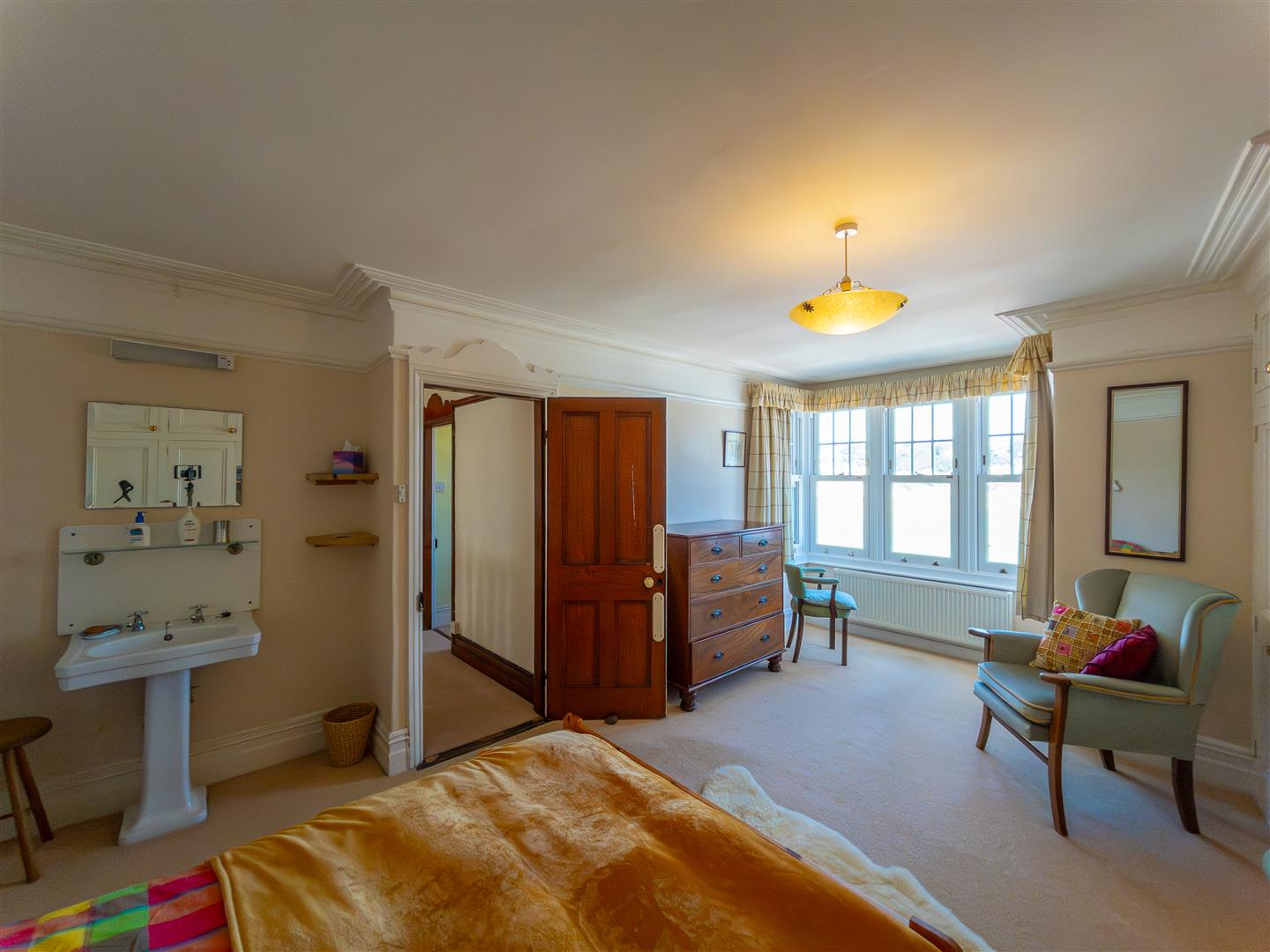Fabulous double bedroom with bay window enjoying a magnificent elevated outlook across Coverack Harbour, beach and the sea beyond. There is a pedestal wash hand basin with splashback, shaving point/light, a fabulous decorative fireplace, built-in wardrobes suite with hanging rails and storage cupboards over and an array of sash windows.