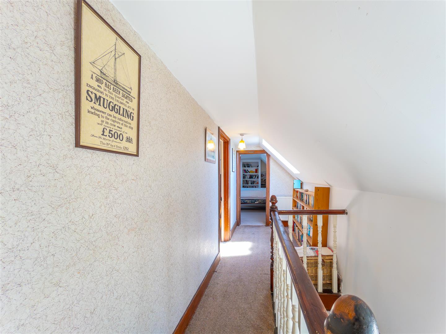 With balustrade, frosted skylight, some restricted head room, doors to bedroom five and bedroom six/store room.