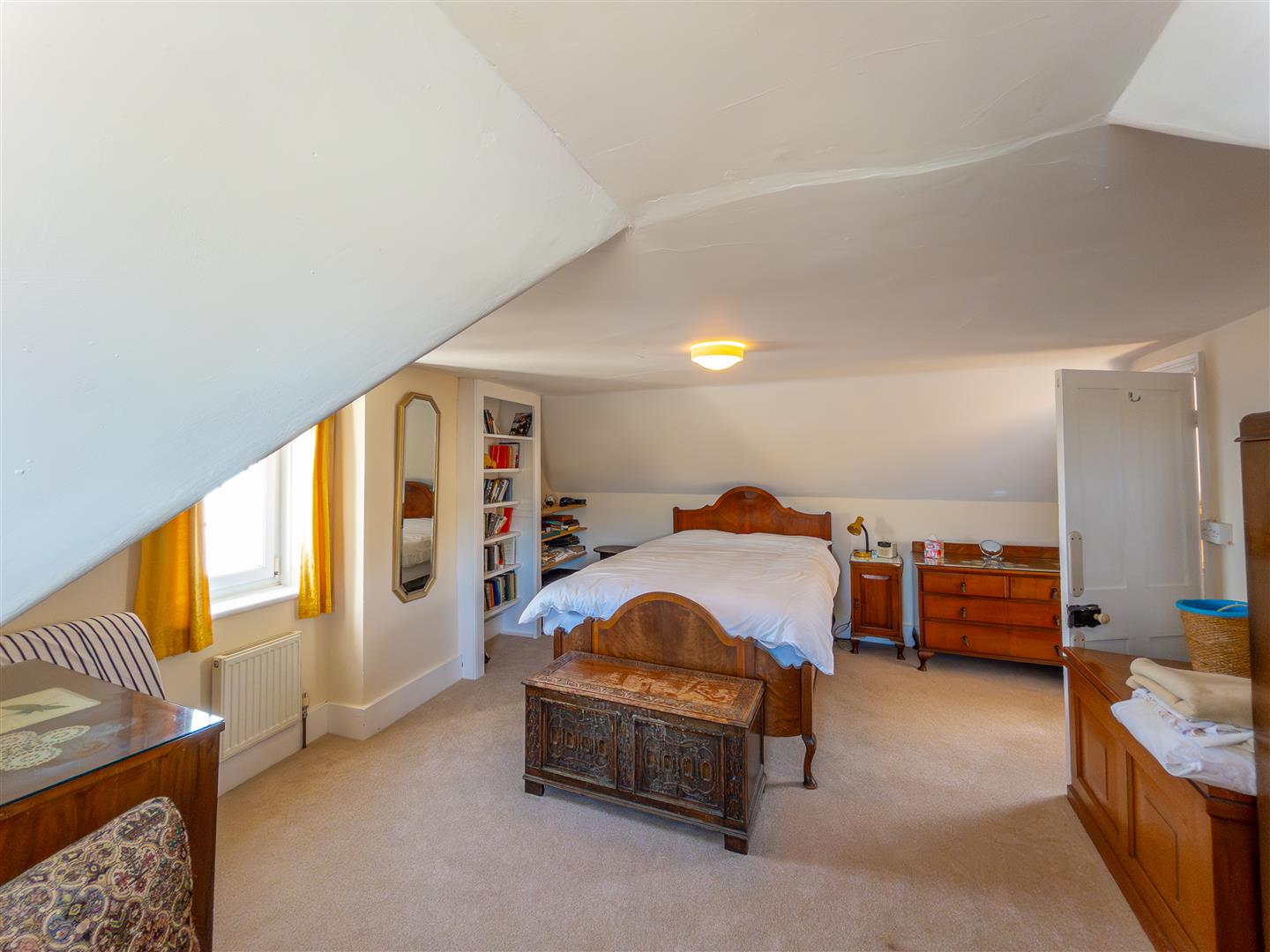 Spacious dual aspect double bedroom enjoying fabulous elevated sea views across the harbour and cove beyond. From the side aspect there is a lovely marine and coastal seascape to enjoy. There is recessed shelving, bookcase and a small area of restricted headroom.