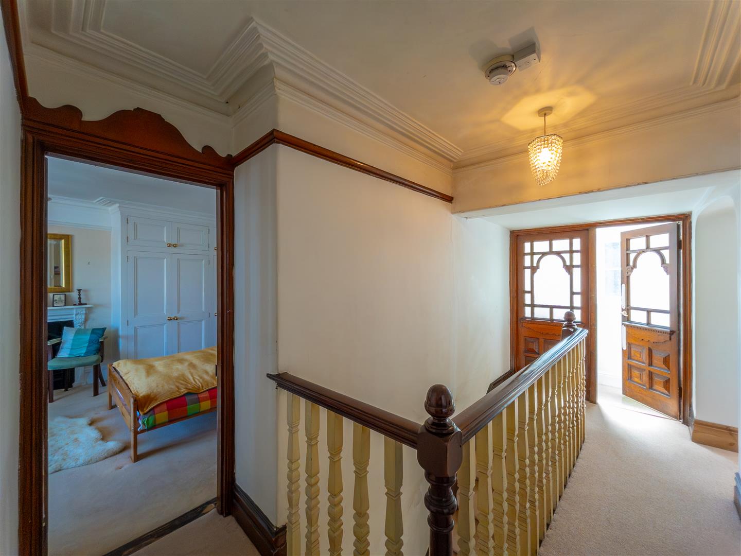 With balustrade, ornate period wood detailing, opening to staircase to second floor, opening to inner landing and doors off to cloakroom and bedrooms one, two and three.