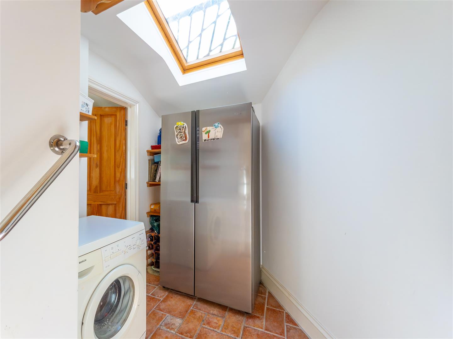 Having space for a washing machine and freestanding American style fridge freezer. With useful shelving to the walls, corner shelving, Velux window, terracotta tiling to the floor and door to the cloakroom.