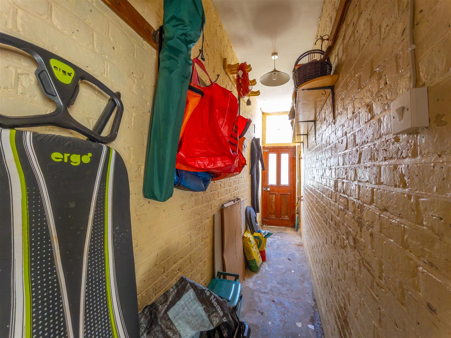 With coat hanging rail, shelving, outside tap and part glazed side entrance door.