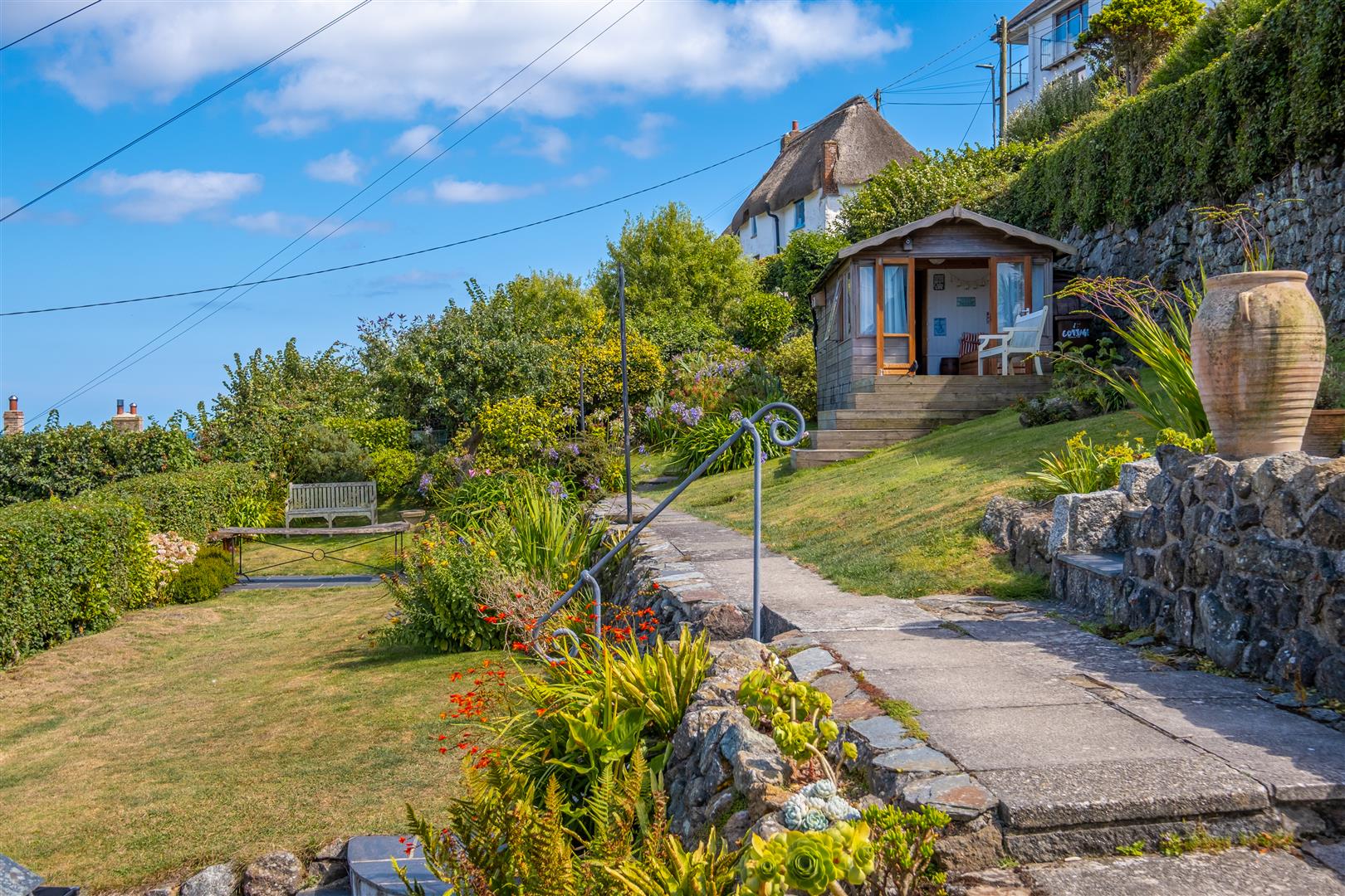 The summerhouse is aptly positioned and benefits from wood flooring, power and light, offering versatility as a studio or work space.