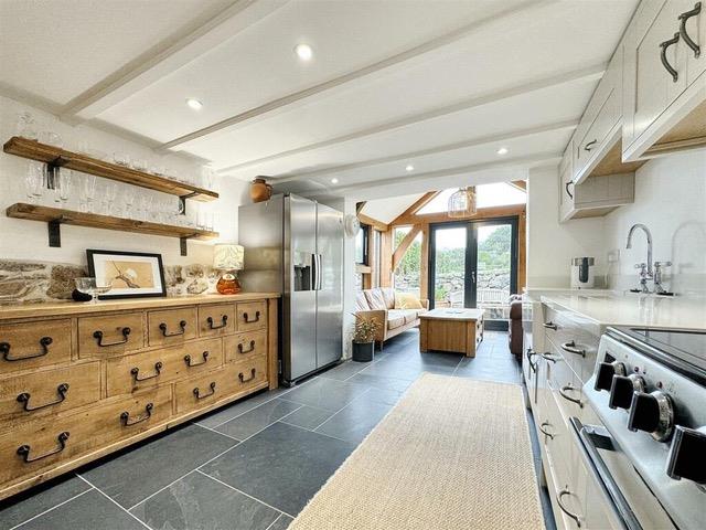 A beautifully crafted contemporary fitted kitchen with quartz working top surfaces, incorporating a double Belfast sink with swan’s neck mixer tap over and matching up stands. There are a range of drawers and cupboards with matching hinged and eye level cupboards over. There is an integrated dishwasher, whilst spaces are provided for an electric cooker (with hood over) and a large freestanding American style fridge freezer. Recessed lighting, exposed local stonework, white beamed ceiling and a continuation of the slate flooring. Opening to sun room.