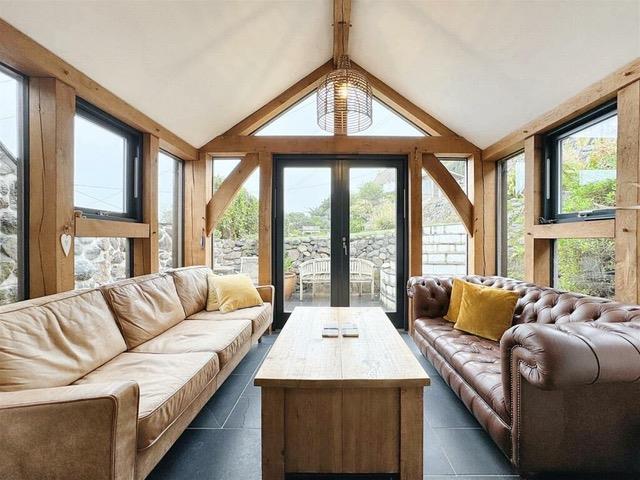 Beautifully appointed triple aspect room, with vaulted ceiling with isoceles feature windows and exposed oak beams. Large French doors open out onto a sheltered patio area, which would seem an ideal place in which to sit and unwind. There are an array of windows providing a delightful outlook over the landscaped gardens, with distant sea views to be enjoyed beyond neighbouring properties.