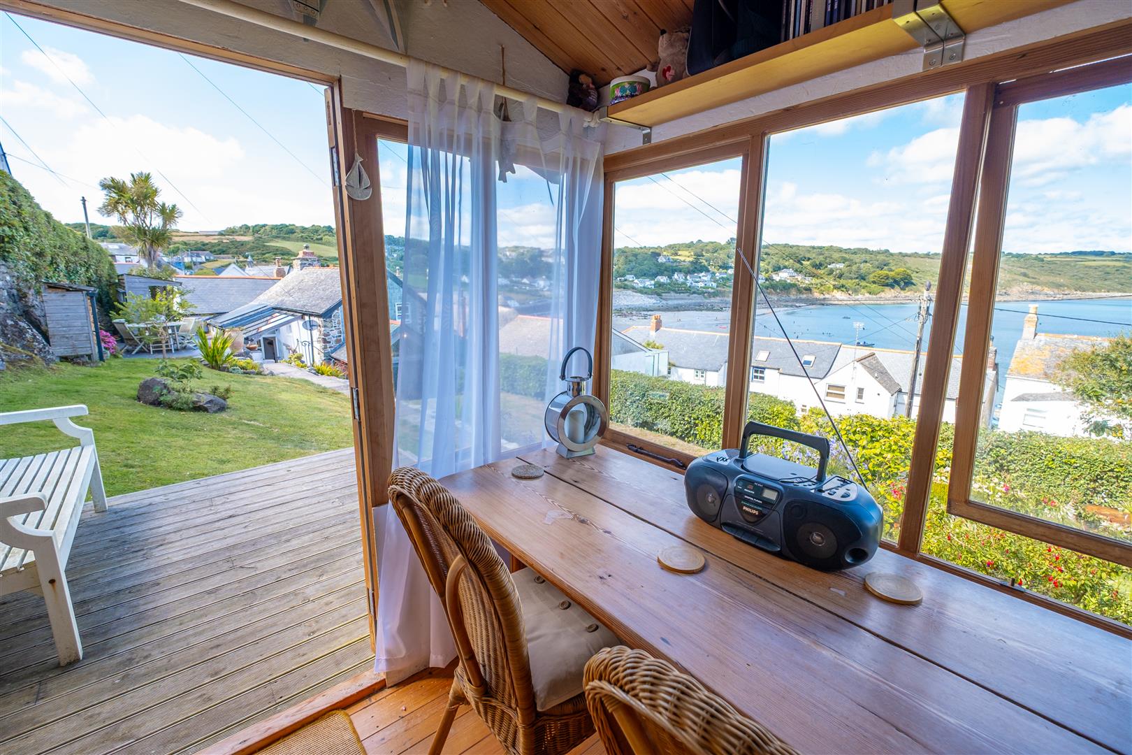 The beautiful tiered gardens to the rear are nicely landscaped and laid largely to lawn with fabulous elevated views across the village to Coverack bay and beyond. Steps from the lovely sheltered sun room patio area lead up to a useful kayak and beach store, beyond which is the rear gate which leads to the public footpath. Enclosed by mature hedging and a Cornish stone wall, the garden enjoys a sunny outlook with further elevated patio and decked areas, seeming to offer the perfect place to enjoy al fresco dining and the enviable coastal views on offer.