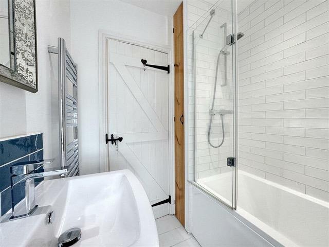 Delightfully appointed with a low-level w.c, wall mounted wash handbasin with mixer tap over and a white panelled bath with shower screen and housing a thermostatic shower. There is white ‘metro style’ tiling, recessed spotlighting, an extractor, a chrome ladder style towel rail, white painted timber flooring and a window to the front aspect with sea glimpses beyond neighbouring properties.