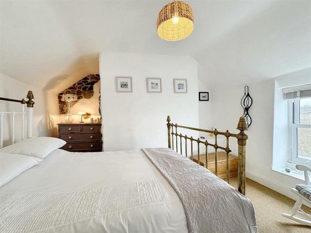 Comfortable double bedroom with built-in wardrobe with hanging rail and storage shelf over. Attractive alcove shelving and recess with exposed local stonework. Exposed timber flooring and window to front aspect enjoying delightful views towards Coverack bay and the sea beyond.