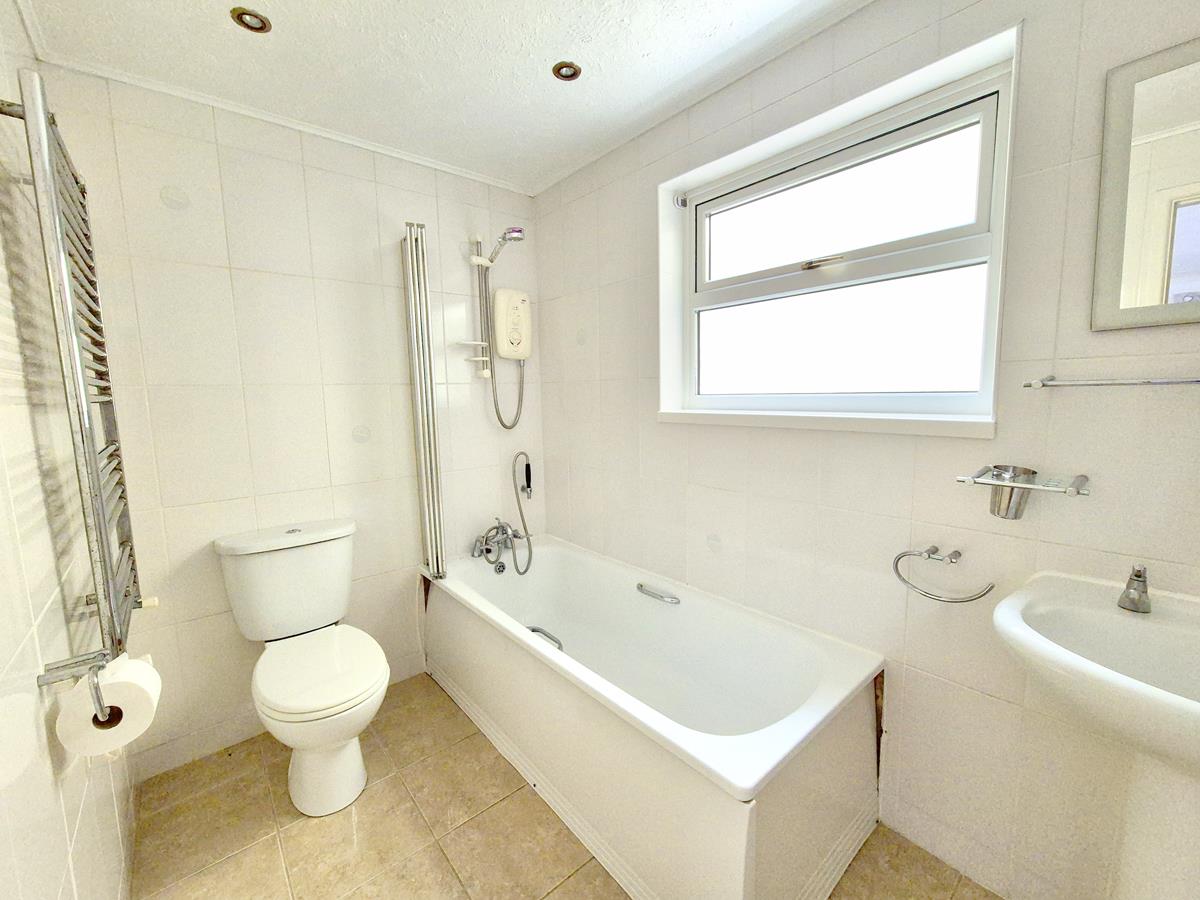 Comprising a close coupled W.C., bath with shower over and mixer tap with flexible shower attachment and a pedestal washbasin. There are tiled walls, tiled floor and frosted window to the side.