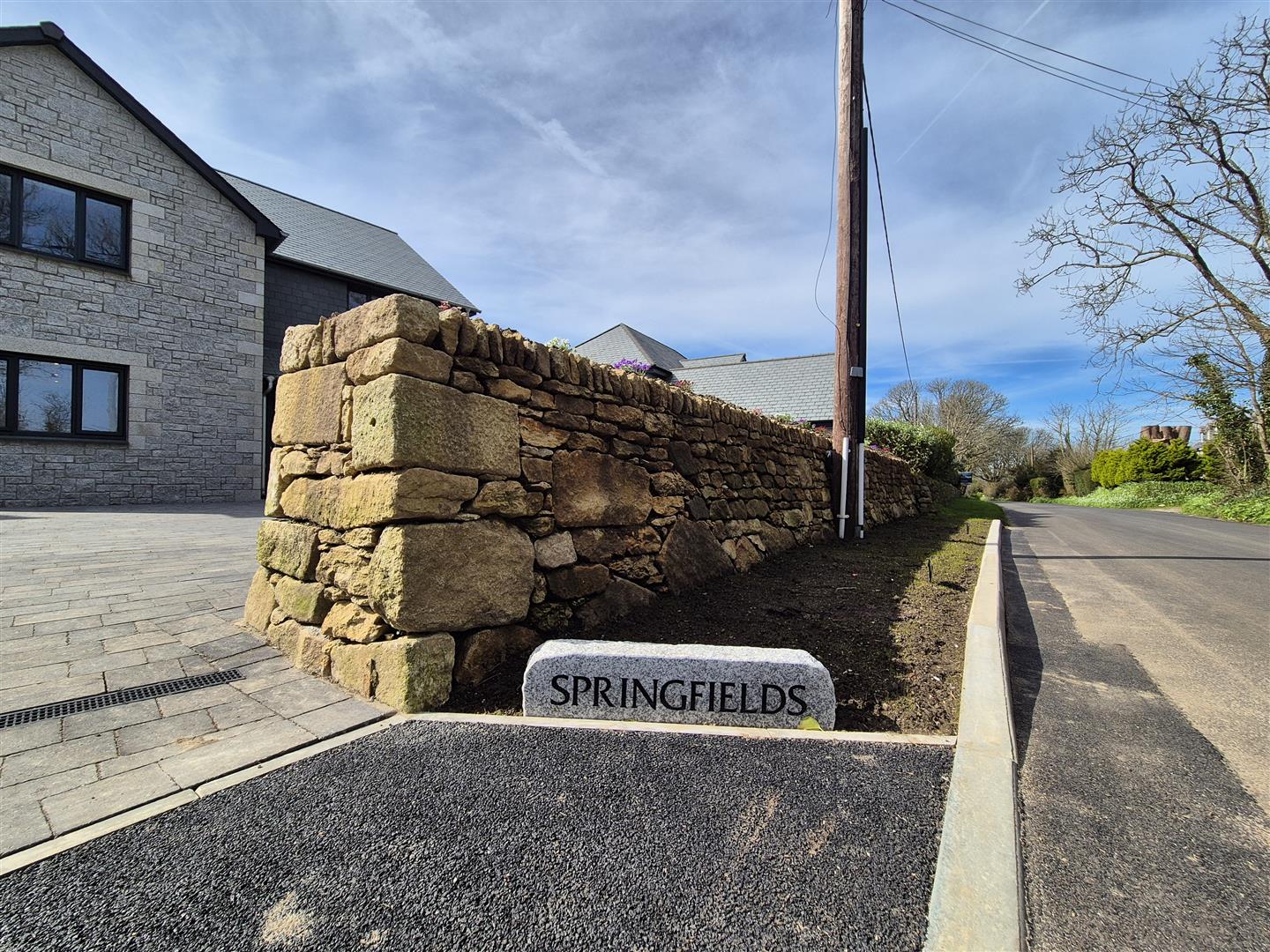 The property is slate hung with Portuguese granite, with white plastered walls to the rear and sides. UPVC anthracite grey windows and doors, anthracite grey garage doors.