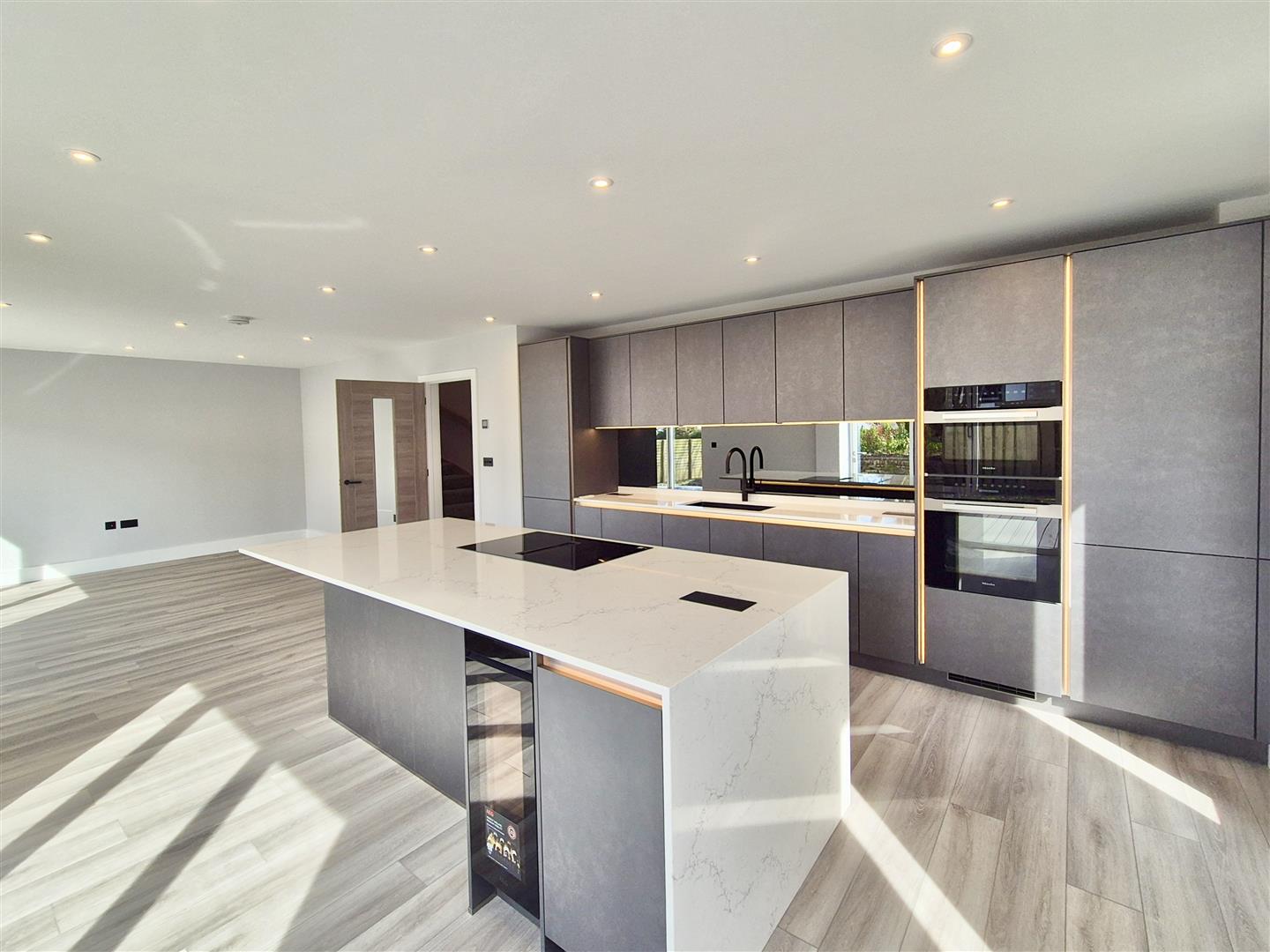 Fitted with a comprehensive range of high quality Nolte cabinets finished in a tactile soft grey with feature integrated remote controlled LED lighting, featuring deep pan drawers and integrated refuse and recycling centre and a fabulous larder cupboard with pull out storage enabling you to effortlessly organise all of your groceries and necessities. The work surfaces are white stone with a soft marble effect with a deep sink with mixer tap and a Quooker boiling hot water tap. A central feature is the island unit providing for additional work surface space and a natural hub for family and guests to gather around with an integrated breakfast bar area. Topline appliances include a Miele eye level oven as well as a Miele combination microwave along with a Miele four zone hob with downdraft extraction and a Miele integrated fridge/freezer. There is also an AEG wine cooler and Evoline back flip worktop sockets with integrated USB chargers. The finishing touches to the kitchen include a mirrored splashback and a fully integrated remote controlled LED lighting system allowing you to really set the mood whether it be party time or a romantic dinner and black sockets and light switches. The kitchen flows effortlessly into the: