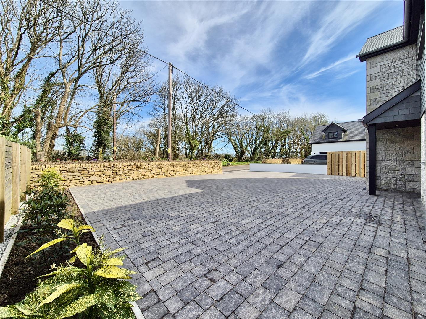 Arrive and park on the expanse of attractive grey block paved parking. To the front is an attractive Cornish stone wall planted with colourful flowers whilst to the side is a border stocked with shrubs. A covered entrance with motion sensor light offers access to the property whilst to the side is the