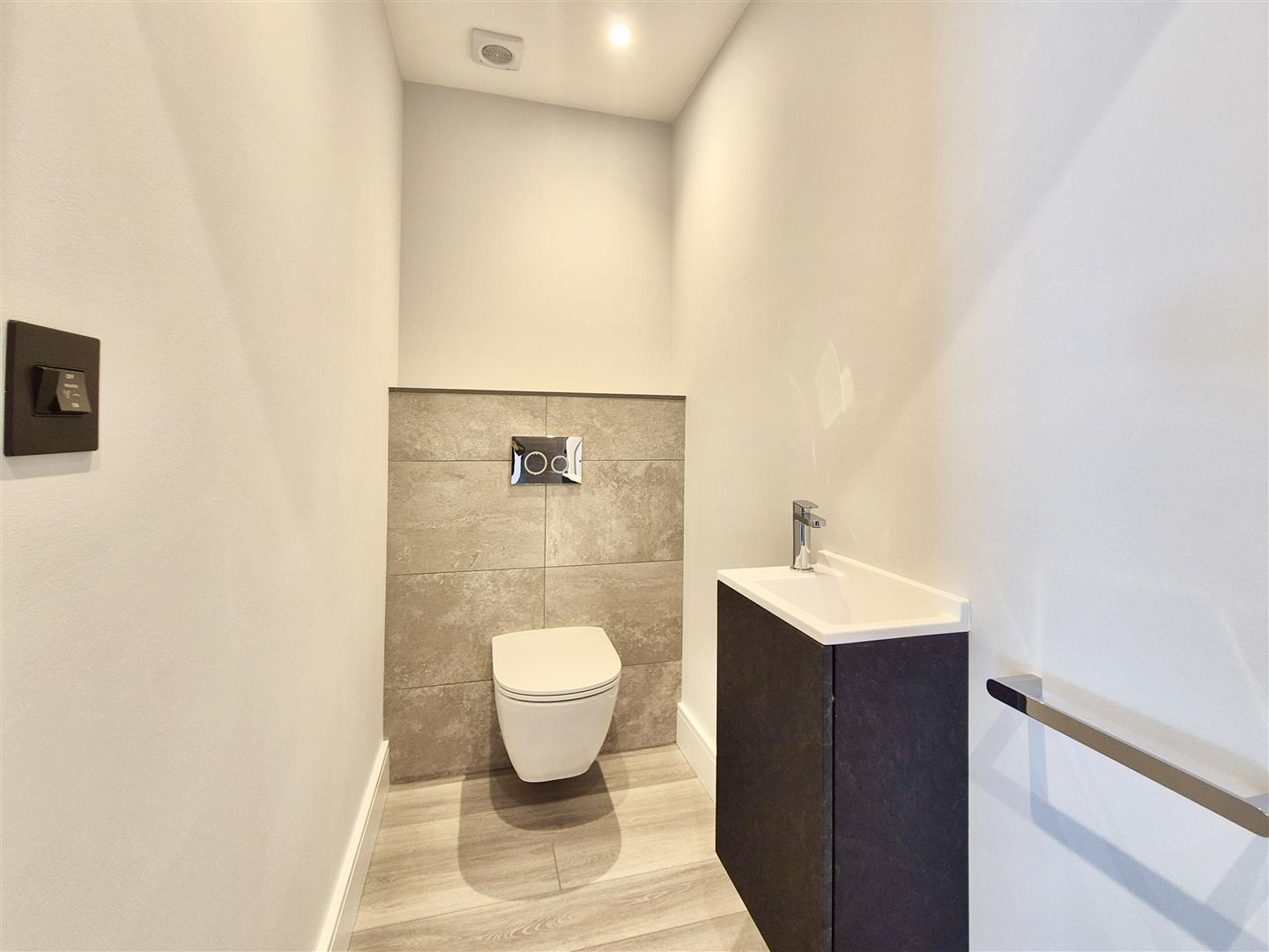 The family bathroom is equally impressive, featuring a freestanding bath alongside a separate shower enclosure. Both bathrooms are finished in large format matt grey tiles and fitted with quality sanitary ware, drench shower heads and handheld wands, continuing the high standard seen throughout the home. A cloakroom on the ground floor completes the accommodation.