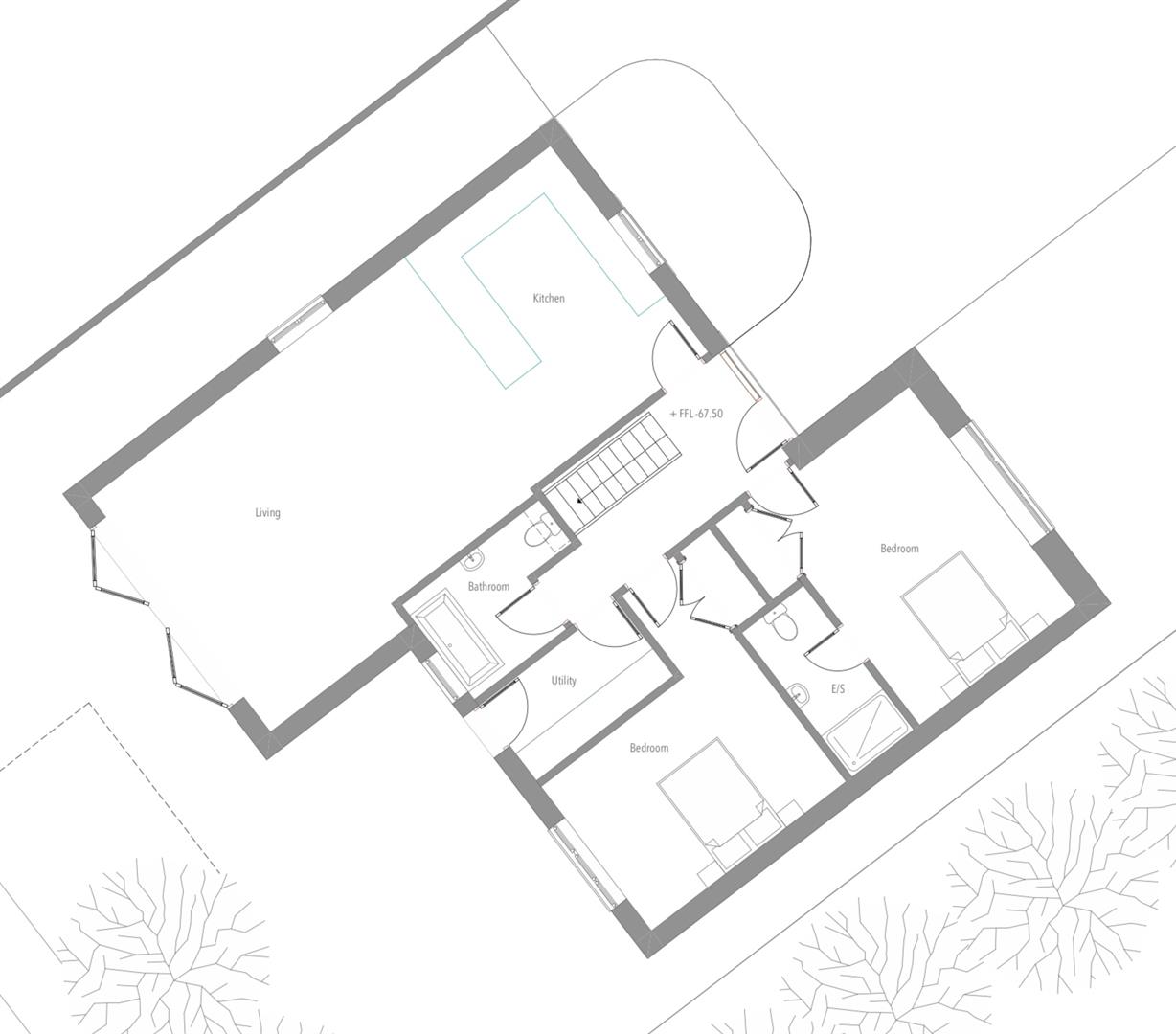 The proposed property has been thoughtfully designed to offer generous living accommodation, including a stunning triple aspect open-plan living area with bi-fold doors opening onto the garden – perfect for modern family life and entertaining. The ground floor also features two double bedrooms, one with an en-suite, a family bathroom, and a utility room.