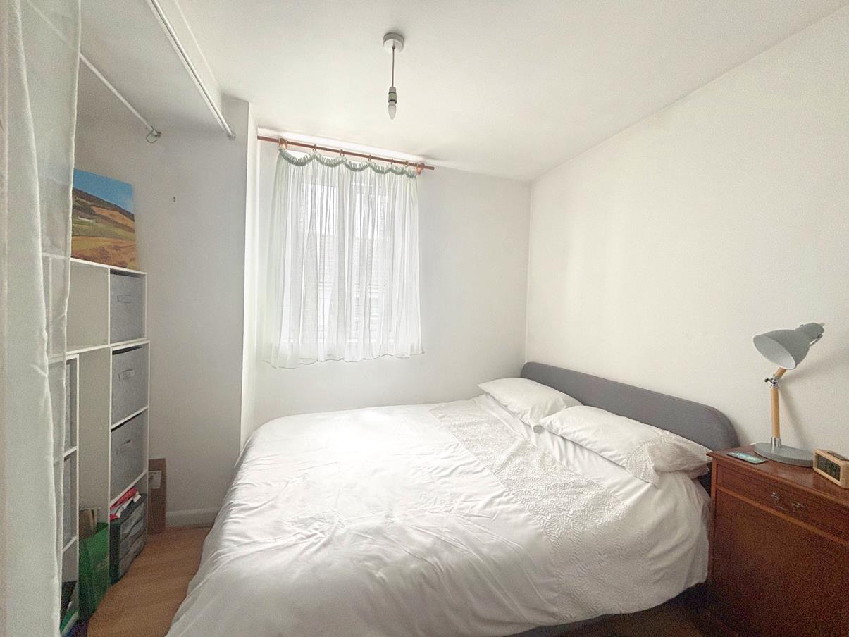 A light and airy room with a window to the side and storage area with hanging rail, hard flooring and wall mounted electric heater.